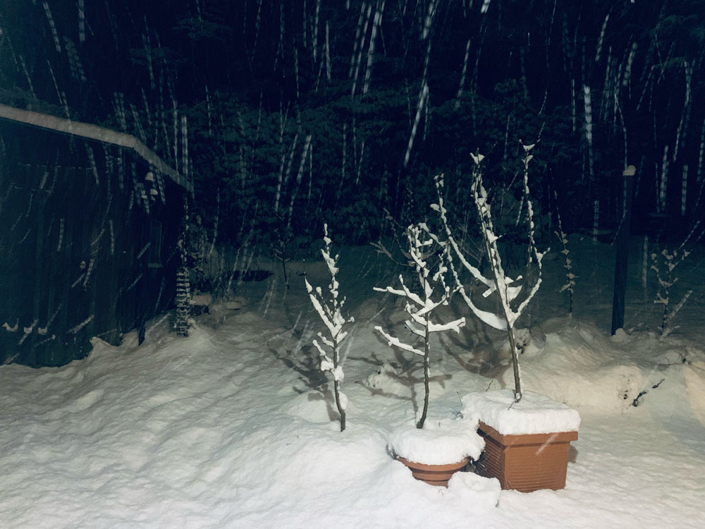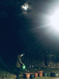 The diary includes watering young trees late at night, observing grafted apple trees through different seasons and weather, and searching out wild apple trees to learn from and graft. It records the yearly rhythm of grafting as a family at the start of spring, the brief intensity of blossom, and visits to other orchards to learn from different approaches and growing conditions.